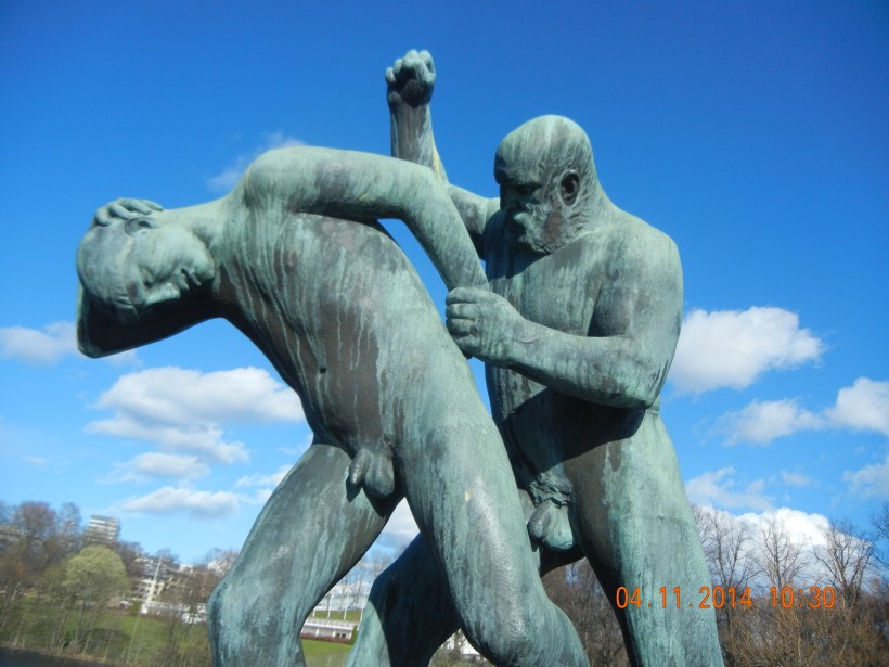 I don’t need anyone to beat me up…”I Can Do That On My Own.” What is interesting to me is the fact that I am writing at this moment at all. I am in Oslo, Norway and the photograph is of the work of a man named Gustav Vigeland. The park has several hundred depictions of human situation. It appears to me they are life situations that we, as humans beings, put ourselves in. The one that I am in right now is one that wonders how I could stop writing for a year or more? Writing in this blog was my time, the time I spent to myself, no grade, no judgement, just my own thoughts. If you read my earlier blogs, you know you are only a fly on my wall. I still have my thoughts, but– (I could add hundreds of excuses here), I guess I allow life to get in my way. I am still a work in progress…getting off one rung at a time.